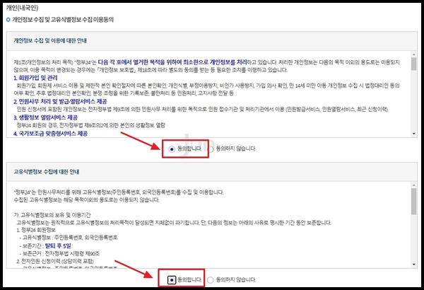 개인정보, 고유식별정보 수집에 관한 동의를 해야 전입신고를 하실 수 있습니다.