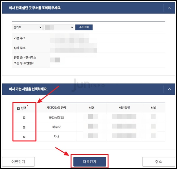 이사 가는 사람을 선택해주시고 다음단계를 누릅니다.
