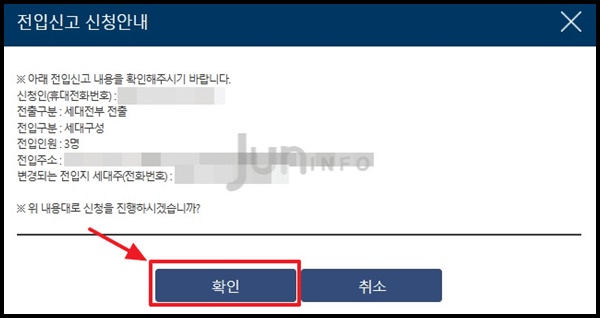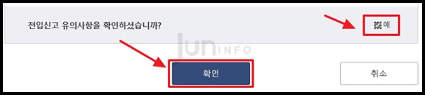 전입신고 유의사항을 읽어보시고 예를 체크하신다음 확인버튼을 눌러주세요.