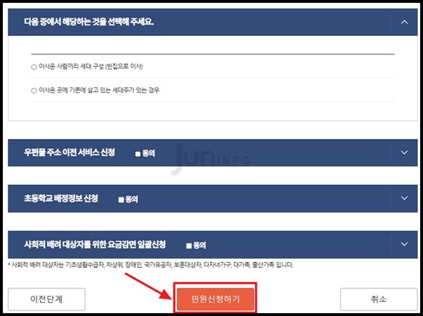 해당하시는 것과 필요하신 서비스를 신청하시고 민원신청하기를 눌러주세요.