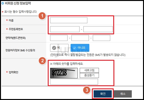 이름, 주민등록번호, 입력확인란의 숫자를 입력해주시고 확인버튼을 눌러주세요.