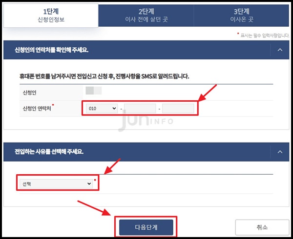 신청인 연락처 입력 및 전입 사유를 선택하시고 다음단계 버튼을 누릅니다.