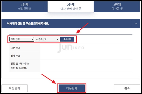 이사전에 살던 곳 주소를 조회하신 다음 다음단계 버튼을 누릅니다.