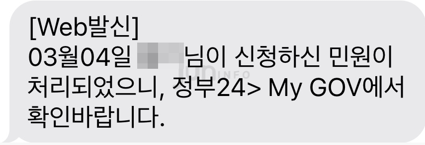 조금 기다리시면 신청하신 민원이 처리되었다는 문자가 옵니다.